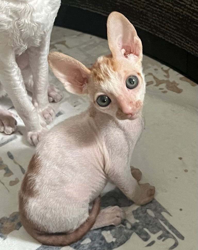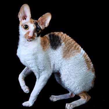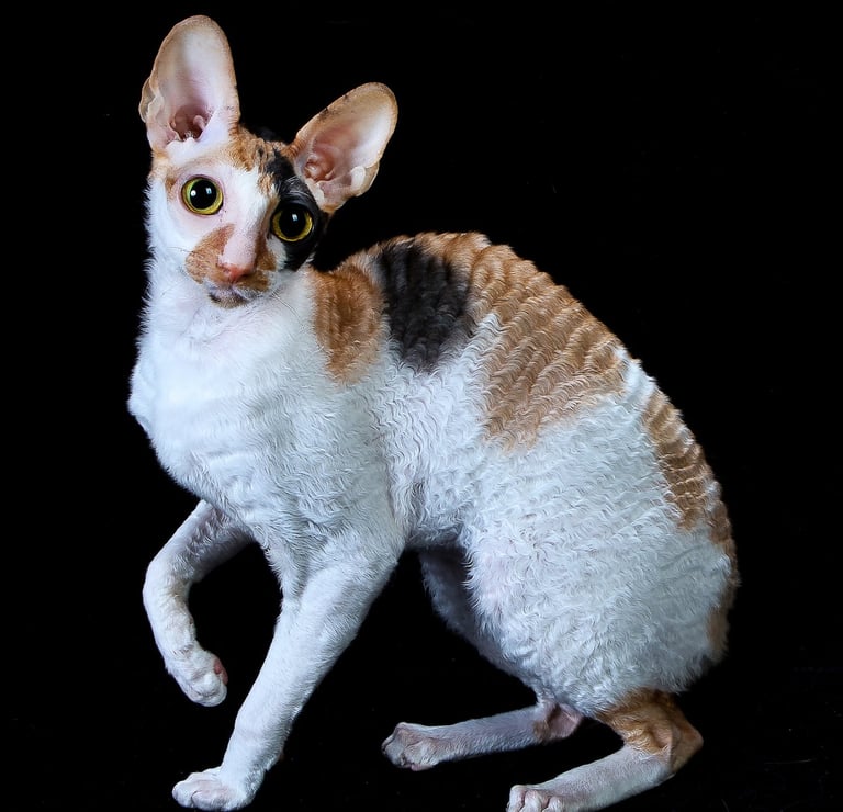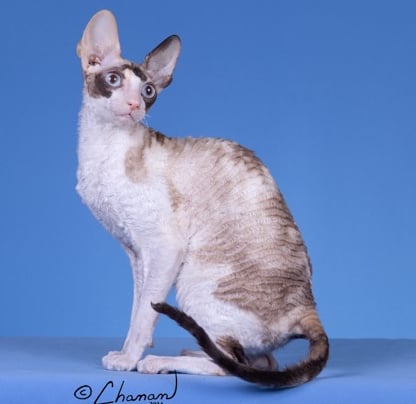 The Cornish Rex is a genetic mutation that originated from a litter of kittens born in the 1950s on a farm in Cornwall, UK. One of the kittens, a cream-colored male named Kallibunker, had an extremely unusual, fine and curly coat; he was the first Cornish Rex. The owner then backcrossed Kallibunker to his mother to produce two other curly-coated kittens. The male, Poldhu, sired a female called Lamorna Cove, who was later brought to America and crossed with a Siamese, giving the breed their long whippy tails and big ears.