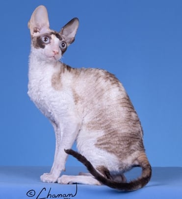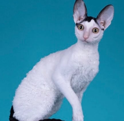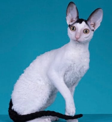 According to the Governing Council of the Cat Fancy (GCCF) standard, the Cornish Rex's colour is irrelevant — therefore the cat may be any colour.